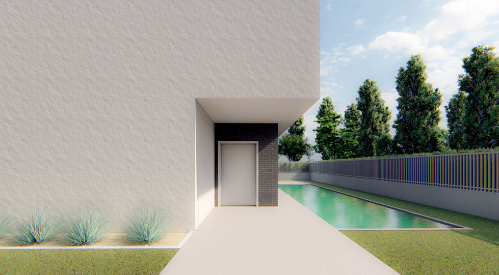 Questa villetta è stata ideata con forme pure, linee semplici, sbalzi e volumi che si intersecano. Anche lo spazio esterno è pensato per dare continuità con allo spazio interno.